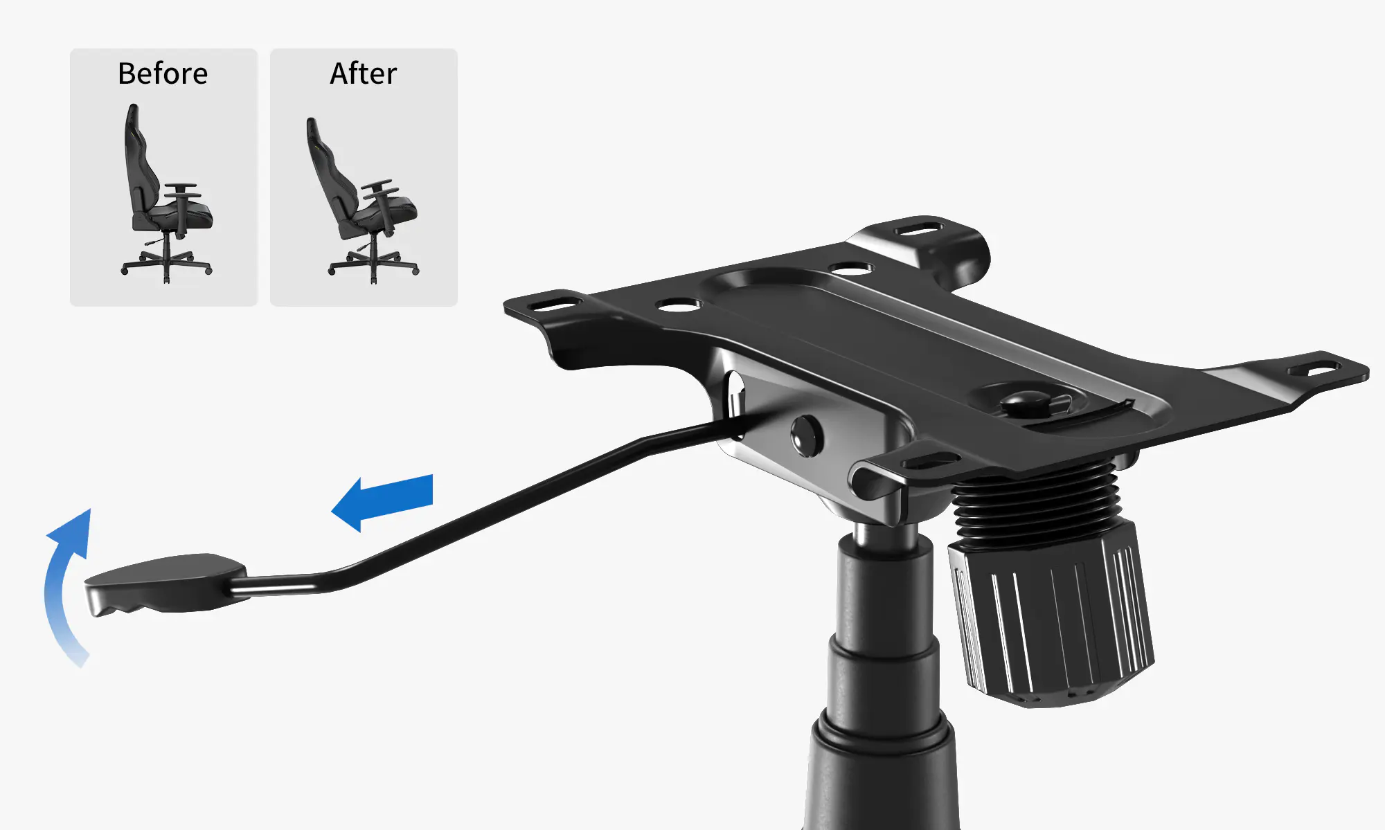 Dostosuj wysokość siedzenia, obracając dźwignię po prawej stronie i blokując ją. Pociągnij lewą dźwignię regulacyjną pod siedzeniem, aby aktywować tryb bujania. Opór bujania można wyregulować przy użyciu pokrętła. Można poluzować opór bujania fotela, obracając pokrętło w prawo, lub zwiększyć opór, obracając je w lewo, w zależności od wagi użytkownika. Niezależnie od tego, czy odchylasz się do przodu, czy opierasz się wygodnie, nasz wielofunkcyjny mechanizm odchylania jest odpowiednim rozwiązaniem dla wszystkich użytkowników. Dzięki niemu możesz określić zakres od 0 do 15 stopni. Jeden ruch umożliwia zablokowanie ustalonego kąta. Gdy skończysz, po prostu zwolnij dźwignię. Siedzenie powróci do pozycji pionowej. Dwie dźwignie w naszym wielofunkcyjnym mechanizmie odchylania zapewnią Ci kontrolę nad komfortem w każdej sytuacji.